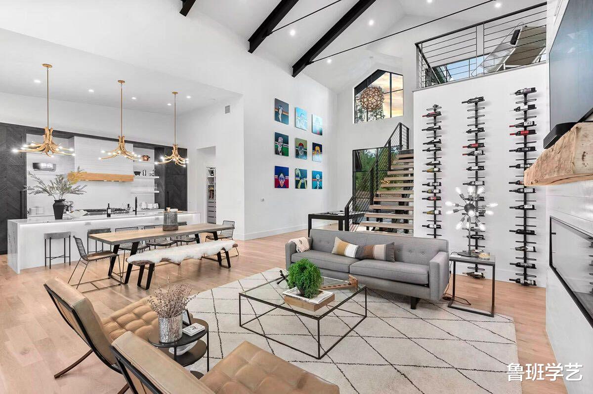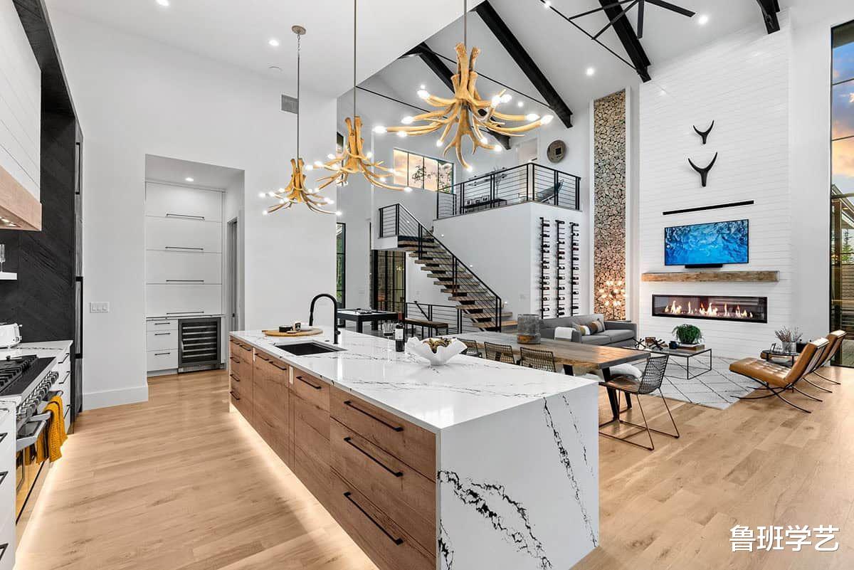 开放式厨房,餐厅,客厅连成一片,整个空间非常大气,并且在一个视角上。厨房位于平台下方,而餐厅和客厅在挑高处,使得电视墙延伸至二楼。