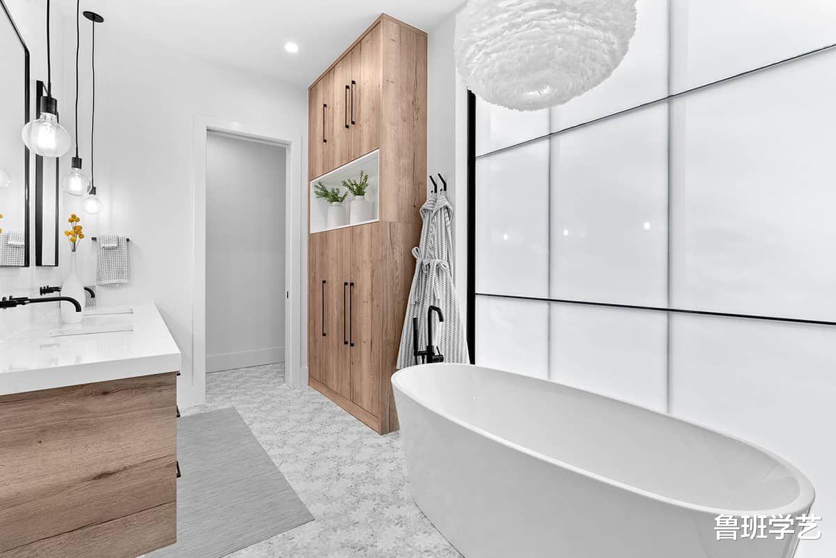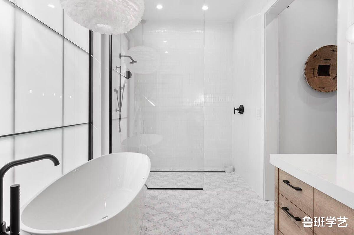 浴缸使用椭圆形设计,陶瓷的光泽与淋浴房的隔断相呼应,这么大的卫生间也就别墅卫生间这么设计了。