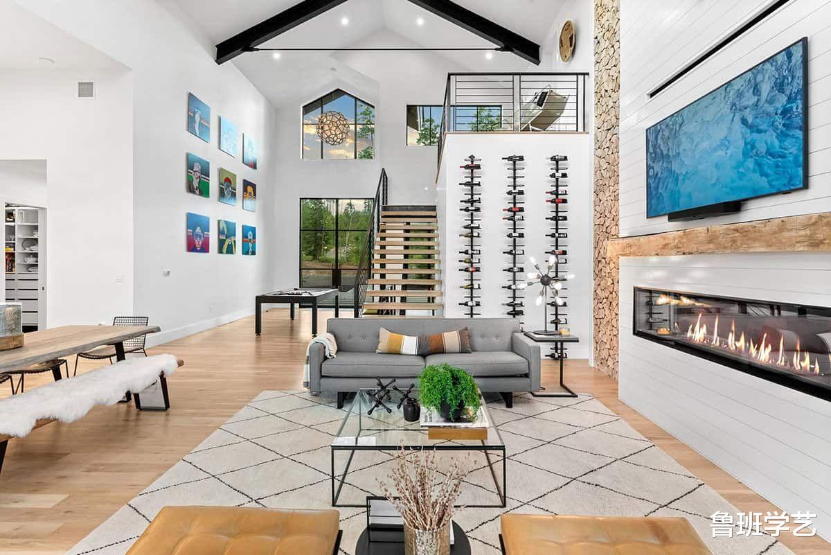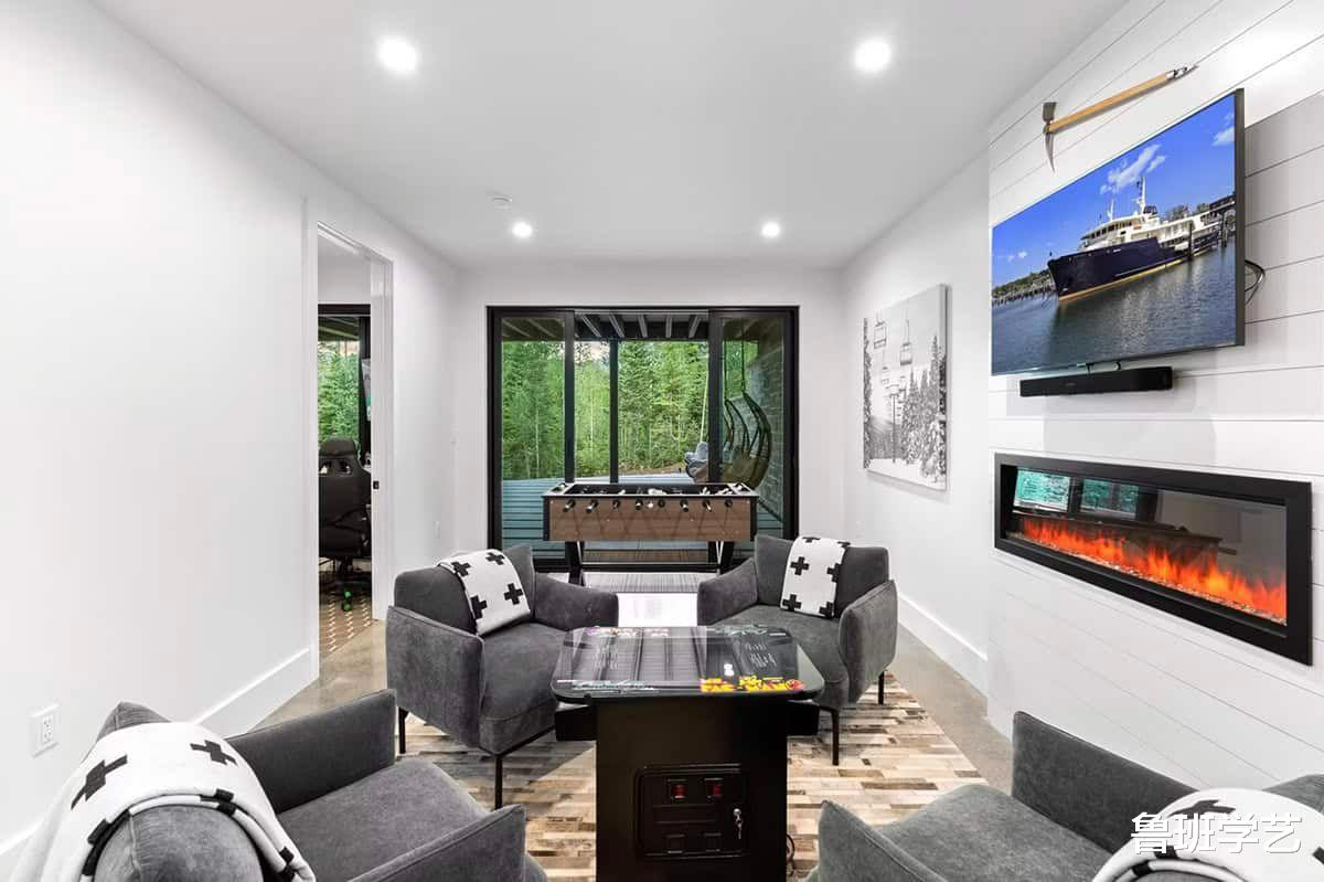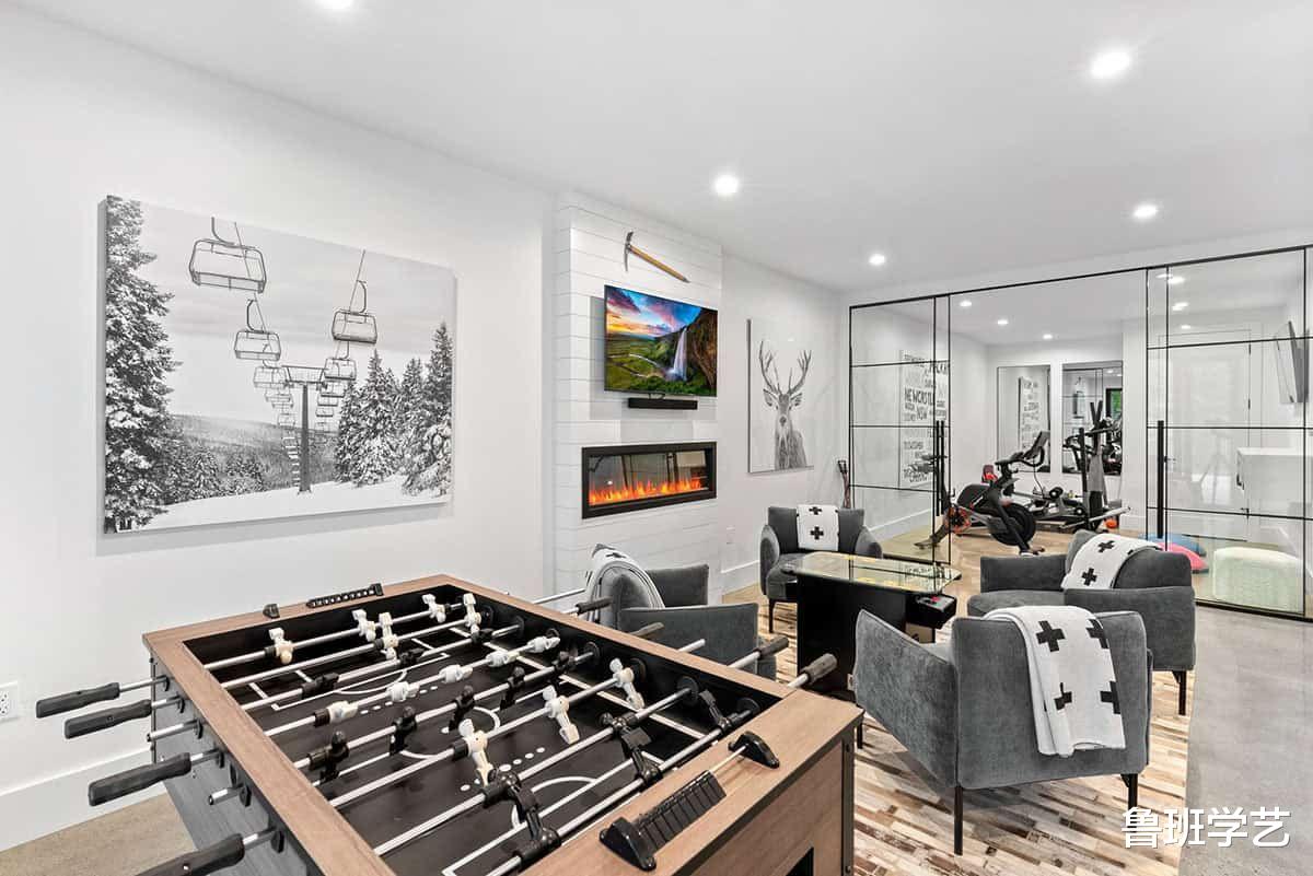 娱乐室紧挨着健身房,娱乐与运动两不耽误,地面采用的是拼接地板,复古色的纹路,搭配白色墙面,以及壁炉装饰。
