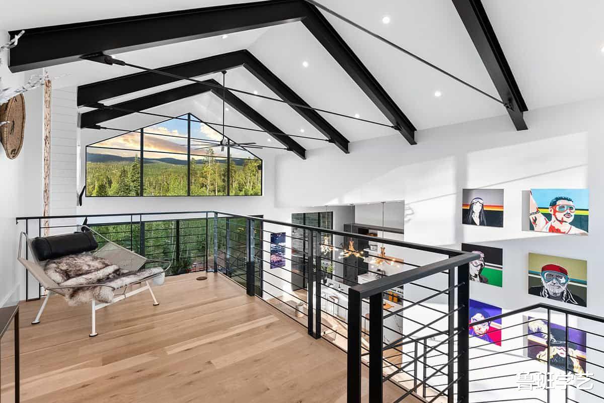 挑高的阁楼平台预留了休息区,可以看是室外的风景,顶面采用钢构露在外面,更加具有现代化气息,也有工业风格的感觉。