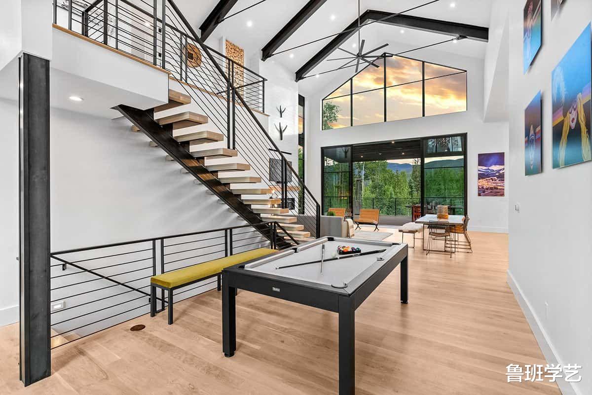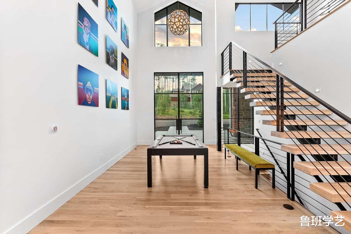 一楼设计个开放式台球室,爱好台球的是非常实用的,既可以自己练习台球技艺,也可以邀请亲朋好友一起。旁边设计的是上二楼的楼梯,采用实木板材与铁艺结合的方式。