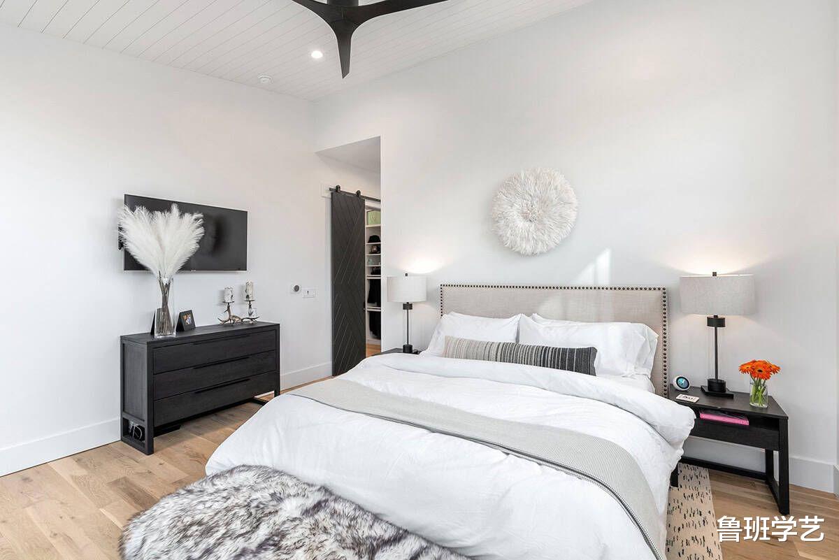 房间是大白墙,配置一张软床也是很简洁大方的。地面铺装实木地板,与深色的床头柜完美区别开。