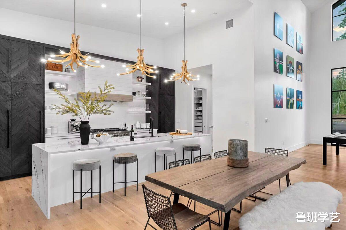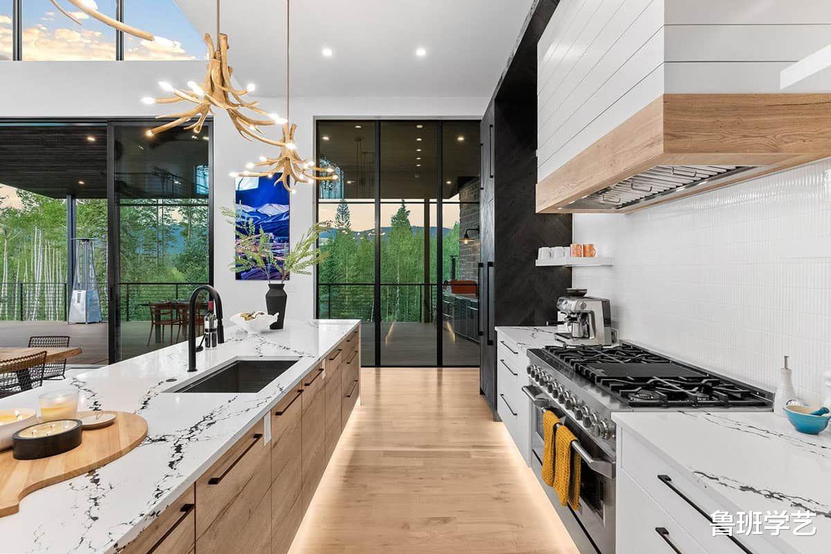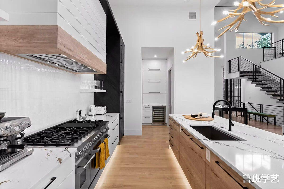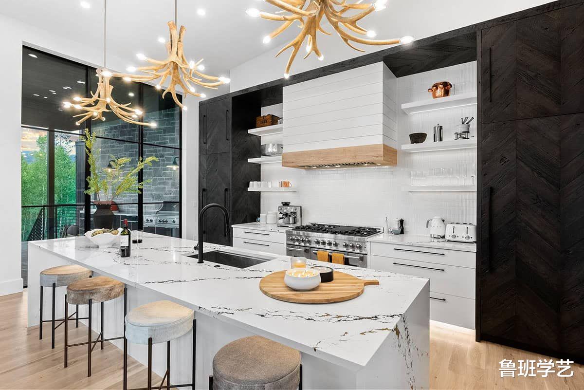 开放式厨房配置的岛台也是与橱柜台面一致,而位于中岛台中间的洗手池也非常实用。一眼看去这才是别墅的档次。