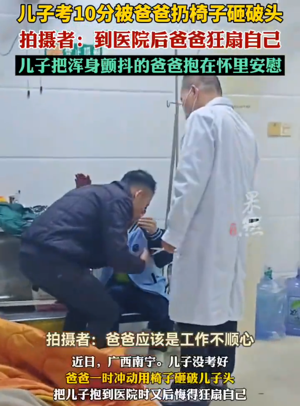 广西南宁一位四年级男孩数学考试仅得10分,父亲得知后怒火中烧。因工作不顺心积压的情绪瞬间爆发,他抄起身边木椅砸向儿子头部,导致孩子头部裂伤、血流不止。伤害发生后,父亲恢复理智,抱起孩子冲往医院。面对儿子苍白的脸庞和缝合的伤口,父亲陷入极度自责,在医院走廊狂扇耳光、用头撞墙,甚至痛哭失声。而最令人动容的是,受伤的孩子反而伸出小手搂住父亲,轻拍其背安慰:“爸爸,别难过”。