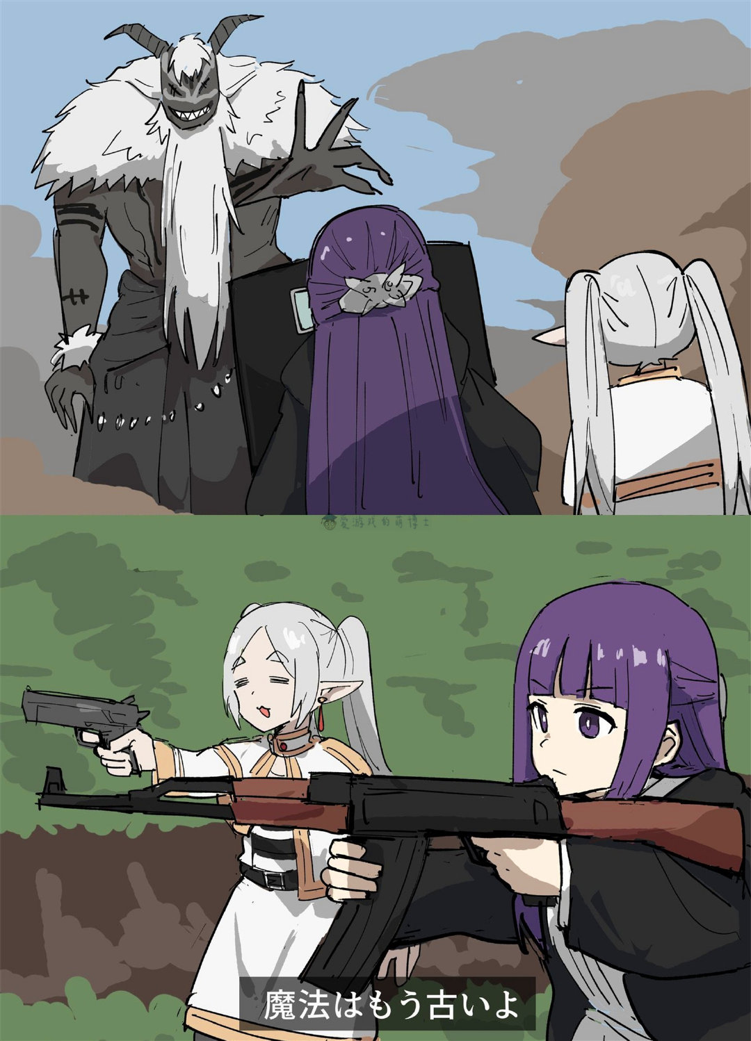 还没完,创作者一不做二不休,还给菲伦的法杖安上了瞄准镜,这是超远距离狙击必备的东西。这脑洞真大啊!网友们纷纷表示:“我以为狙击枪的枪口冲着自己”、“本来就是魔法狙击手,挺适合的”、“好玩”、“火力展示魔法!”、“菲伦就是传说中的狙击手,可以使用远距离射人的魔法”、“不得不说,这张脸绝了”!