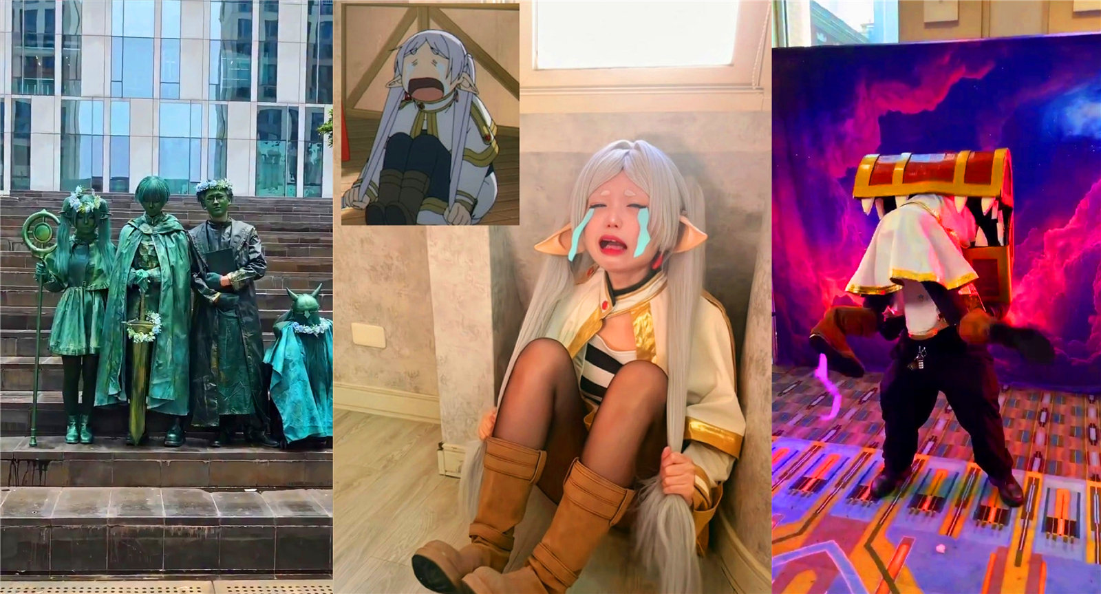 近期,《葬送的芙莉莲》动漫相当火,博士也分享了一些优质的Cosplay作品,比如:一位昵称为“Neneko”的Coser模仿了芙莉莲“双眼紧闭、嘴巴大张、眼泪狂飙”的崩溃神态,非常有趣;还有人扮演宝箱怪,而“芙莉莲”的下半身是其制作的道具。Coser的手与“芙莉莲”的膝盖接触,通过操作还原双腿在外面乱蹬的经典动作。