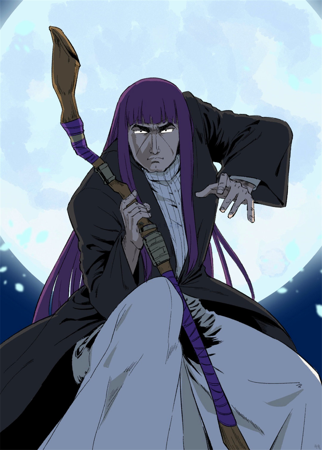 这个,不试不知道,一试吓一跳!“4氏”并没有花太多功夫,只是将菲伦的脸蛋换成了一个男人的面貌,脸颊两侧有两道明显的痕迹,粗黑的剑眉下是锐利的吊梢眼,眼神冷酷且充满压迫感,唇线紧绷,整体气质凶悍、沉稳,带有强烈的威慑力。菲伦从女孩子变成大叔(这可能是某个ACG角色,但是博士没认出来)后,整个感觉全变了!而值得一提的是:其他的角色细节却没有变化,还是紫色长发和那熟悉的衣服和法杖。