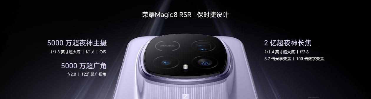 影像维度,荣耀Magic8 RSR 保时捷设计搭载荣耀最顶级的超夜神影像系统,配备2亿像素超夜神长焦和5000万像素超夜神主摄,超大尺寸传感器、超大光圈与顶级镜组结构协同发力,奠定卓越光学品质基础。