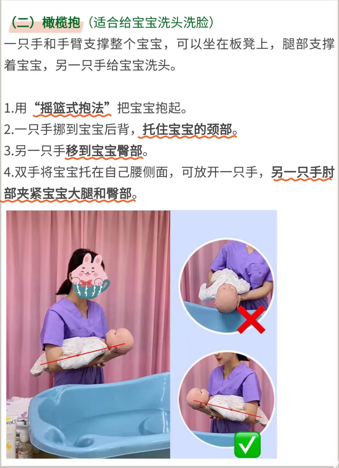 橄榄抱(适合洗头洗脸):像夹橄榄球一样把宝宝夹在腋下,一只手托住头颈,另一只手操作。