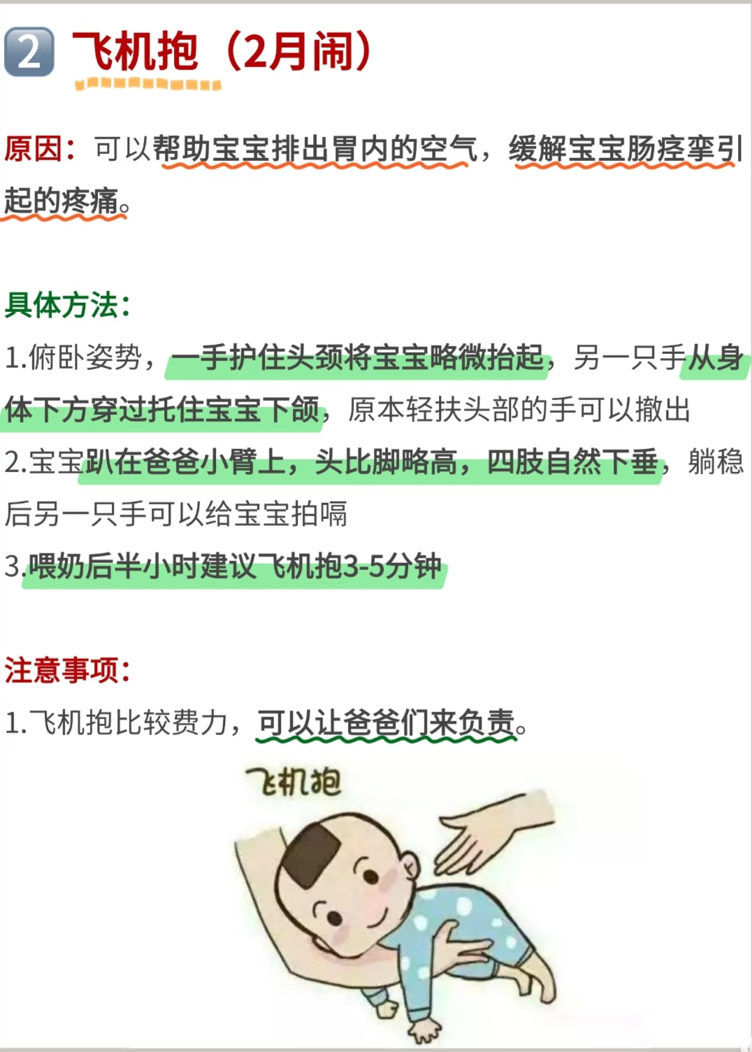正确做法:把宝宝的头放在你的肘窝处,手掌张开托住他的肚子和胸口,另一只手稳稳扶住后背和腿。宝宝的四肢自然下垂,像在开飞机。