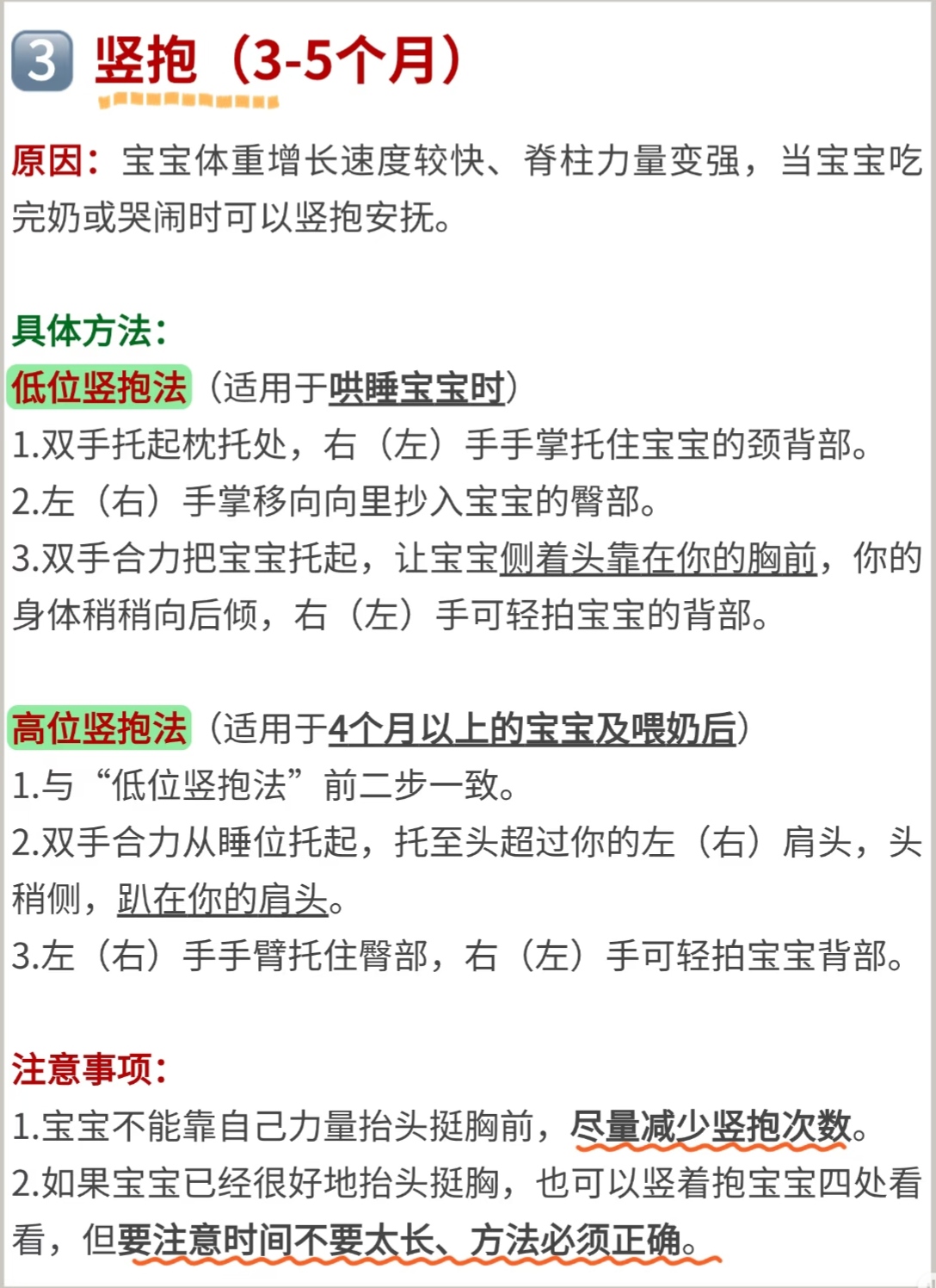 正确做法:一只手托住头颈,另一只手托住小屁股,让宝宝趴在你的肩膀上,下巴刚好超过你的肩膀高度。你的身体微微后仰,把宝宝的重量均匀分散在你身上。