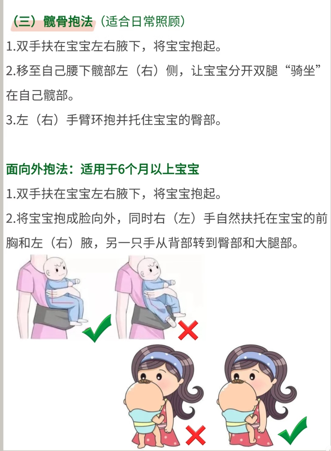 正确做法:只要不勒着、不扭着,侧抱、面对面抱、从腋下托着抱……怎么舒服怎么来!但注意,仍然要避免剧烈摇晃和单侧长时间受力。