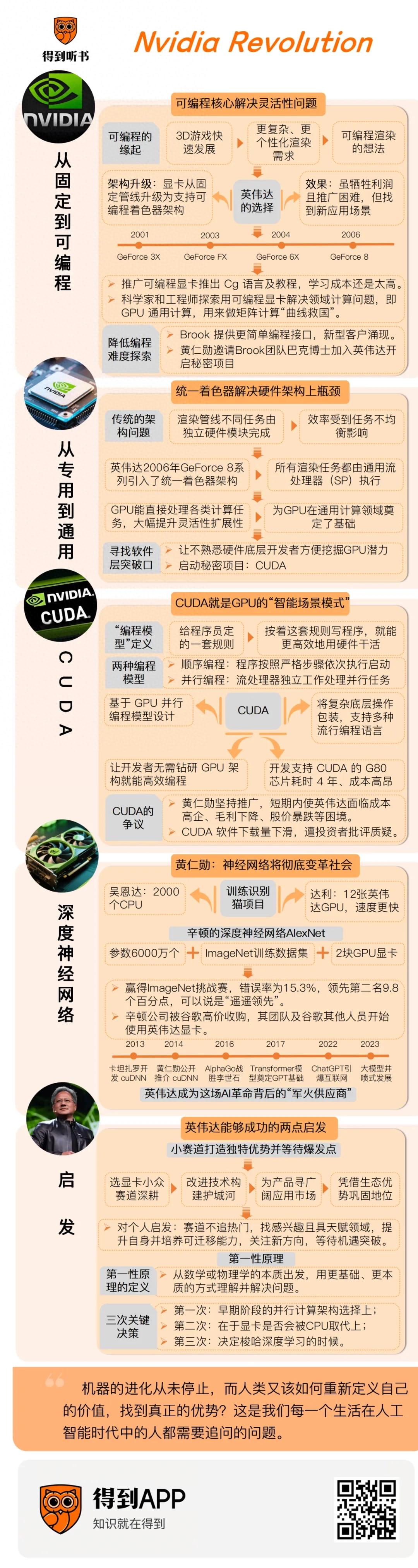 这给我们的启发是,当我们在自己喜欢和擅长的道路上埋头赶路时,不要忘了“抬头看天”,需要像英伟达那样,努力让自己的能力具备更强的“泛化性”,培养自己的底层、可迁移的能力,并且向外探索能力可以延展的新方向。一旦风口来临,就可以凭借长期积累的专注与洞察,把握住机会,实现快速突破。