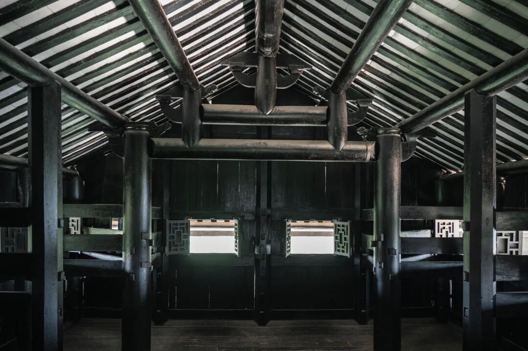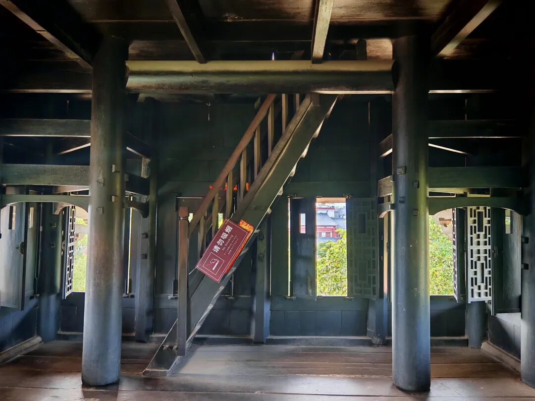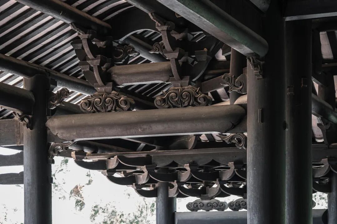 走上楼阁的瞬间,指尖触到的格木带着温润的凉意,仿佛四百多年的时光都被封存在了木质的纹理里。全阁近3000根构件,小到指甲盖大小的木楔,大到两人合抱的立柱,没有一处用了铁钉。穿斗式构架像一张精密的网,把这些格木串联成一个稳固的整体——斜穿的木枋与直套的木柱咬合,凸起的榫头与凹陷的卯眼嵌合,每一处连接都像大自然里咬合的树叶与枝丫,浑然天成。20根巨柱里,8根直通顶楼,它们是楼阁的脊梁,承受着三层楼板、梁架与瓦脊的全部重量。柱身上每一朵斗拱都不只是装饰,四朵斗拱托起四根棱木,像四只稳稳的手,把楼阁的荷载均匀地传递到每一根立柱上。