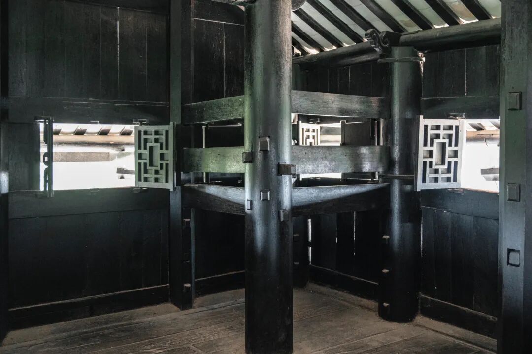 最让人惊叹的,永远是二楼那四根悬空的内柱。站在二楼的回廊上,低头就能看见柱脚与楼板之间那3厘米的空隙——这3厘米,是真武阁最骄傲的宣言,也是中国古代建筑智慧最惊艳的注脚。这四根柱子明明承受着上层所有的重量,却偏偏不肯落地,仿佛被无形的力量托举着。很少有人能说清其中的奥秘,直到看见那些横贯在通柱上的挑枋才恍然大悟:从底层通到二层的八根通柱,被巧妙地变成了二、三层的支点,每根通柱上都横贯着九根挑枋,七十二根挑枋像天平的横杆,外面长的一端挑起宽阔的瓦檐,里面短的一端则轻轻“提”起了这四根内柱。就像抬轿的轿夫,用肩膀的力量把轿子稳稳抬起,这些挑枋也用杠杆的原理,让四根内柱在头顶千斤的同时,依然能保持悬空的姿态。
