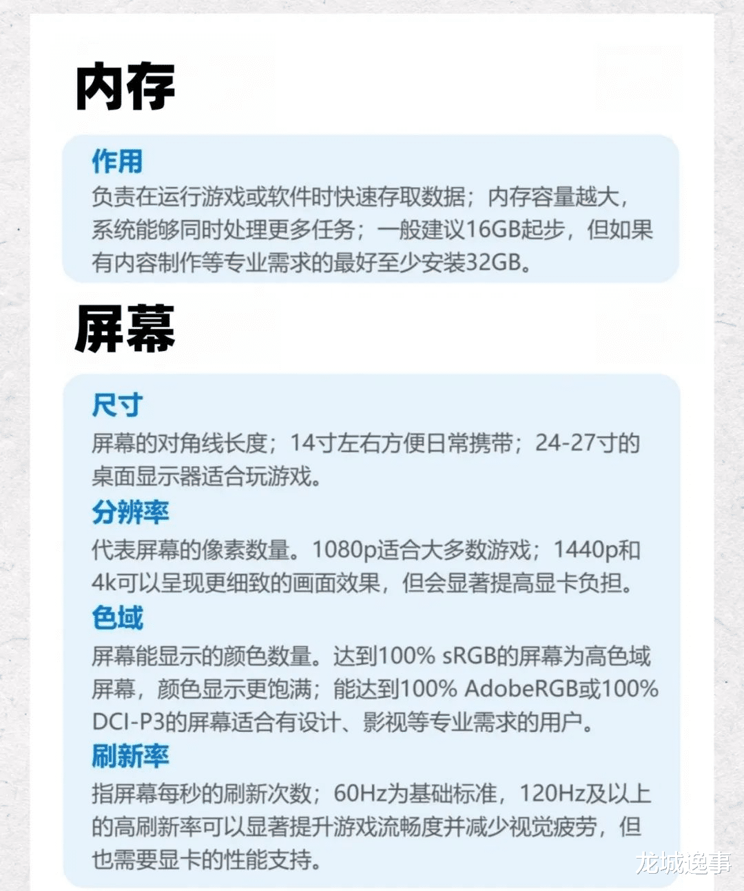 很多大学生在入学前选购新电脑的时候因不懂电脑配置,容易在电脑城被黑心商家骗。今天教会大家看电脑配置,识别黑心商家的蒙骗。1、CPU - 现在CPU的主要阵营是Intel的酷睿系列和AMD的锐龙系列⚙Intel命名规则:【系列】i9>i7>i5>i3【代数】最新是14代,数字越高越好【级别】数字越大代表性能越强【后缀】不带后缀为标准版;K=支持超频,F=没有核心显卡,U=低功耗,H=高性能移动版⚙️AMD命名规则【系列】R9 > R7 > R5 > R3【代数】数字越大越新【性能级别】越大越好【后缀】不带后缀为标准版;3D=专为游戏优化;X=高性能,U=低电压,H=高性能移动版❗️对比不同型号时请结合系列,代数,性能级别,和后缀来综合判断2、显卡 - 分为集成显卡和独立显卡【集成显卡】集成在CPU或主板上的显卡,适合办公至轻度游戏【独立显卡】独立于CPU或主板的显卡,性能一般更加强大,可以满足大型游戏以及设计,渲染等需求。【厂商区别】✅NVIDIA显卡【定位】RTX(可光线追踪)> GTX (不支持光线追踪,较老)> MX(入门级)【系列】数字越大越新【型号】数字越大性能越好【后缀】Ti > SUPER > 普通版 > M(移动版)【显存大小】越大越好️AMD显卡【定位】目前市面上RX系列为主流【系列】数字越大越新【型号】数字越大性能越强【后缀】XT > X > 普通版 > M3、硬盘 - 分为机械和固态硬盘建议购买512G以上的固态硬盘,没啥必要再购买机械硬盘。预算够的话,直接上1T的固态硬盘。4、内存建议购买8G以上的内存,预算够的话,建议购买16G的内存。...........................