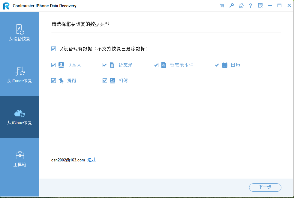 02检测到设备后,系统将提示您选择要恢复的文件类型。选择“消息”,然后点击“下一步”继续。