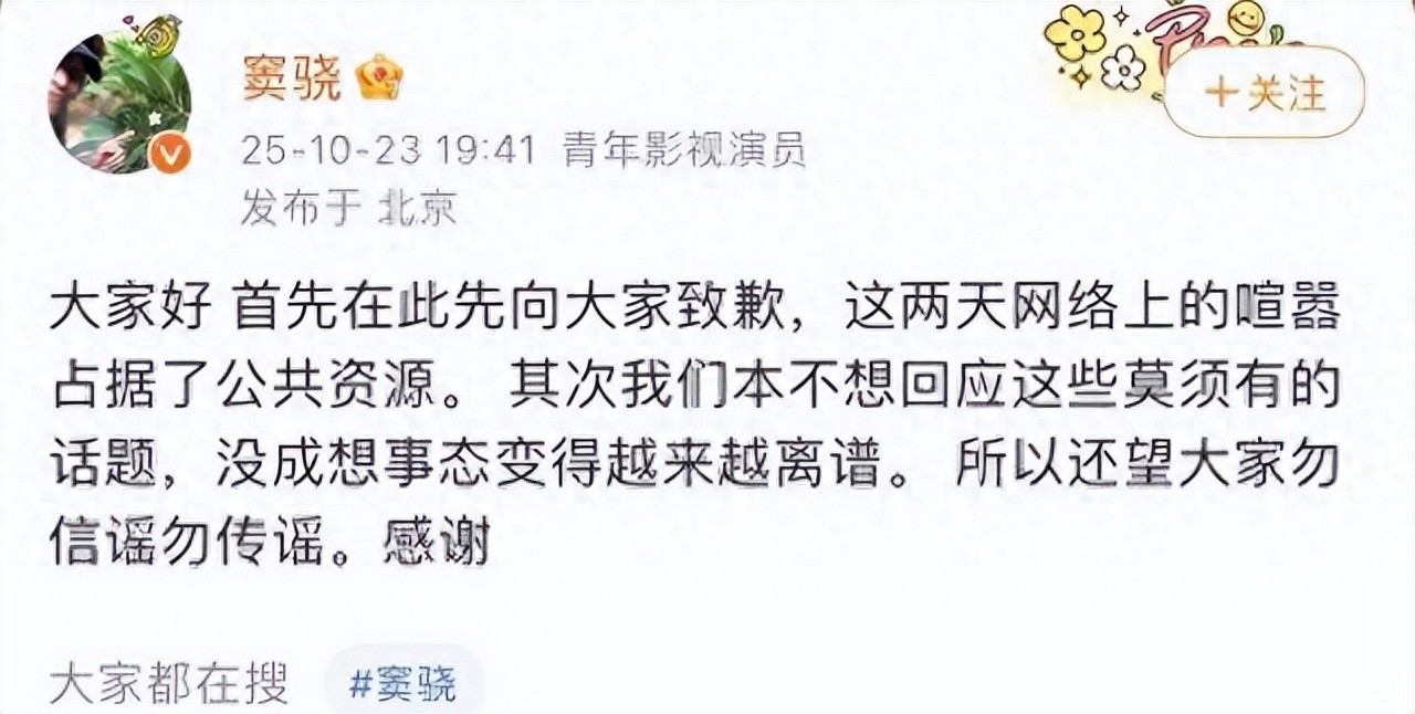 有人说他怂,说他不护妻,可没过两天,窦骁直接在社交平台发了四个字“纯属谣言”。