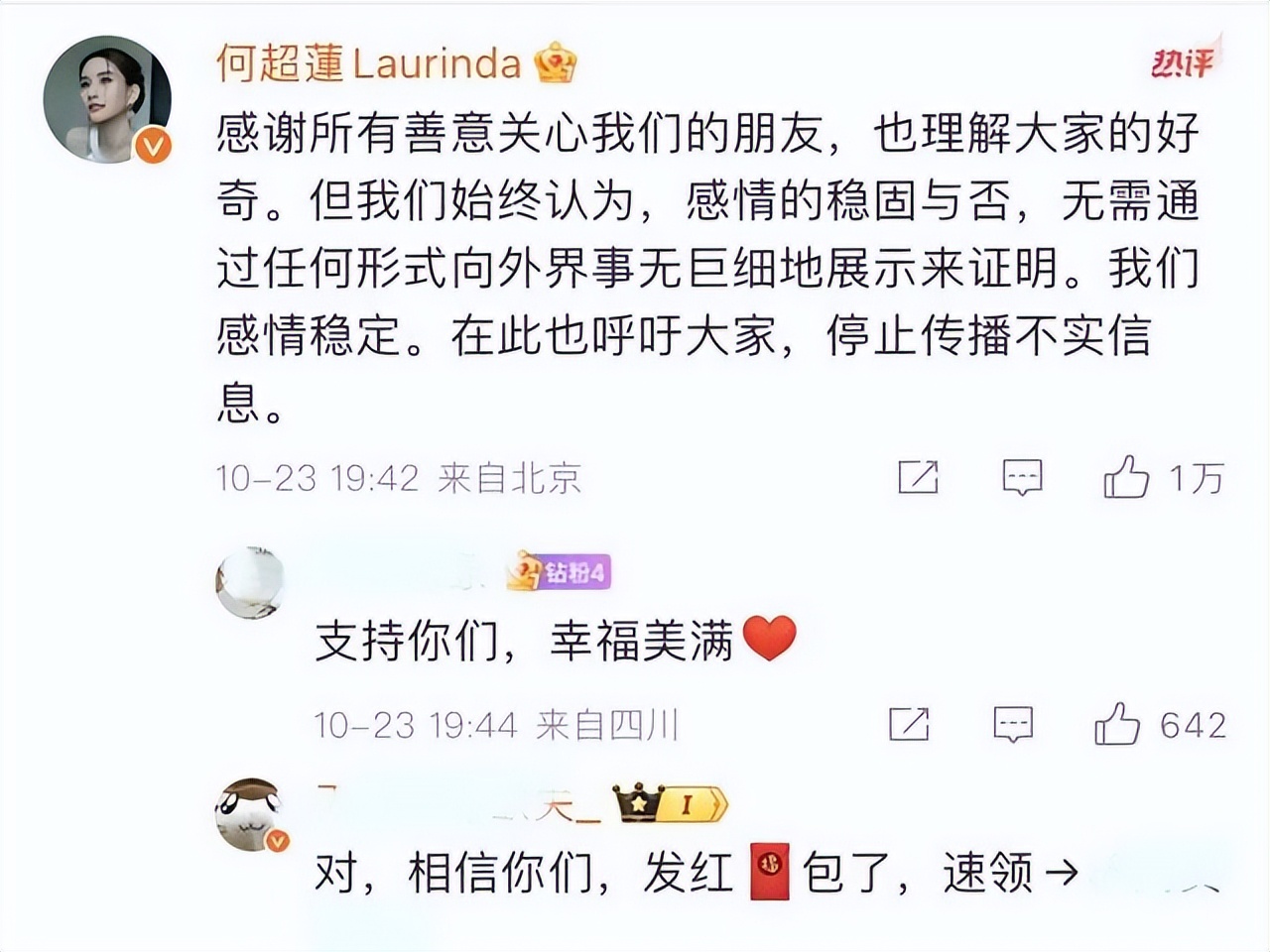夫妻同频窦骁的纯属谣言刚发出去半小时,何超莲就转发了,还加了句“谣言太夸张,必须说清楚”。
