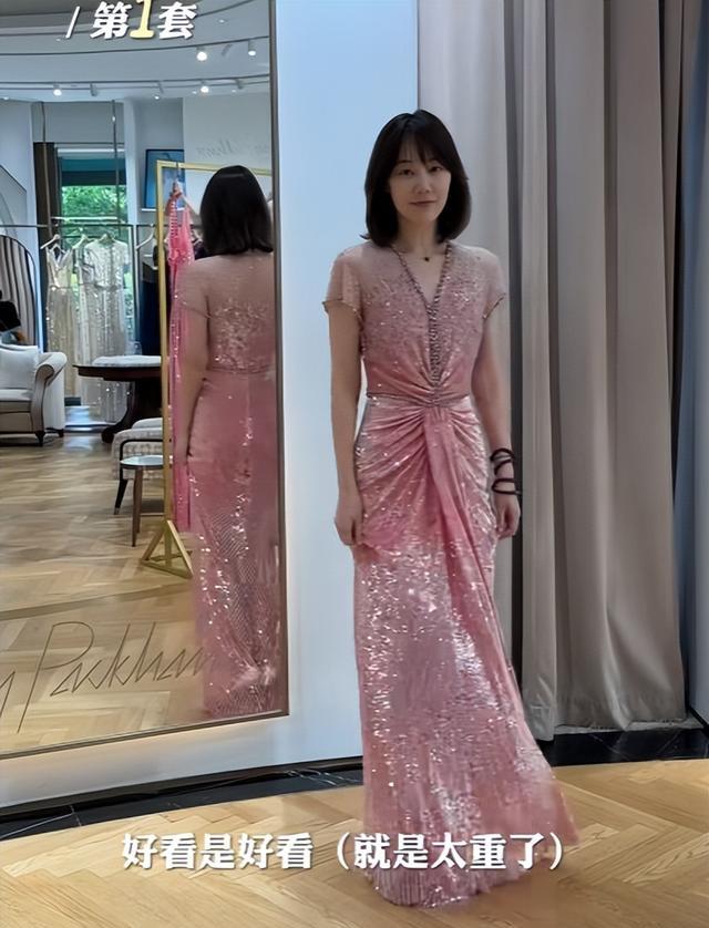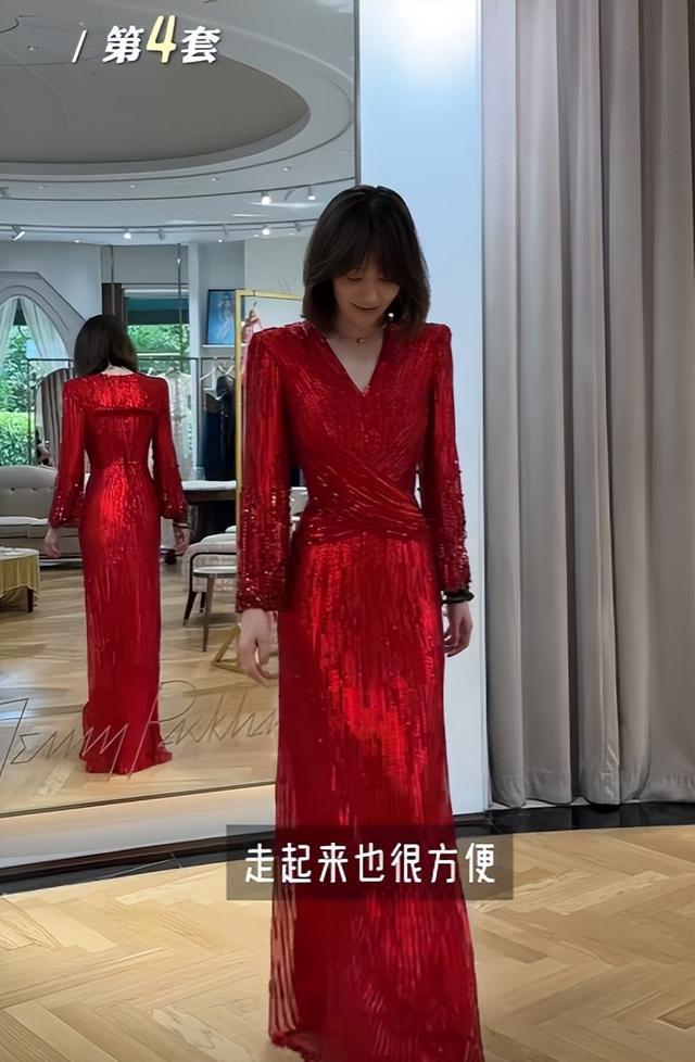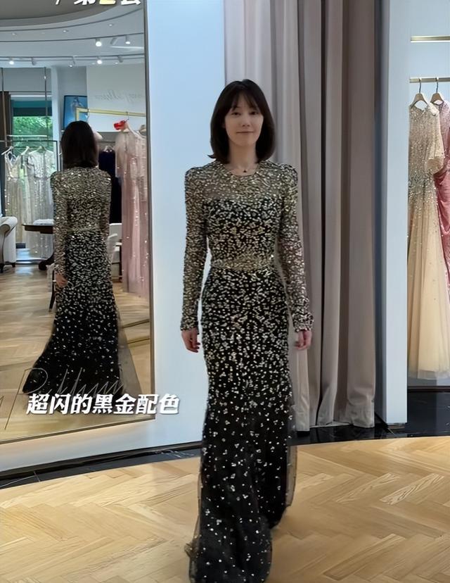 这件金色亮片的黑裙更是十分的富贵,和刚刚那件完全不是一个风格的,小编觉得这件比较合适,不过似乎冠姐并不中意,