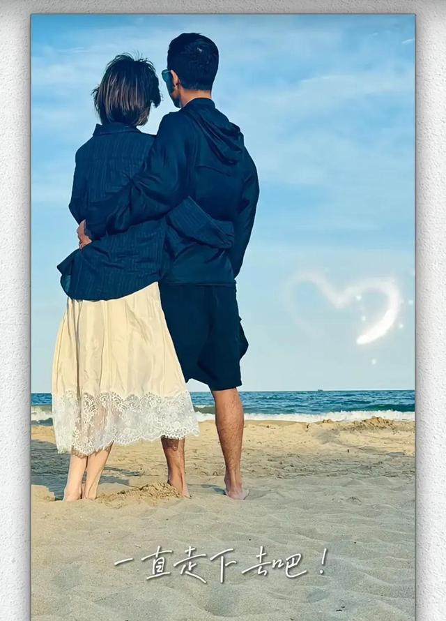 两人依偎在一起,享受着海边的风与美景,这个男人的个子还挺高,比冠姐高了半个头,