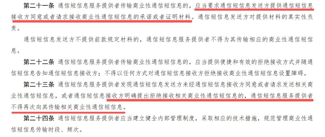 第一道红线:没得到你同意,就不能发新规明确规定,短信服务提供者应当要求短信发送方提供接收方同意的有关材料,并予以留存。短信服务提供者发现短信发送方未经接收方同意发送商业短信,或者接收方拒绝接收的,不得再次传输。