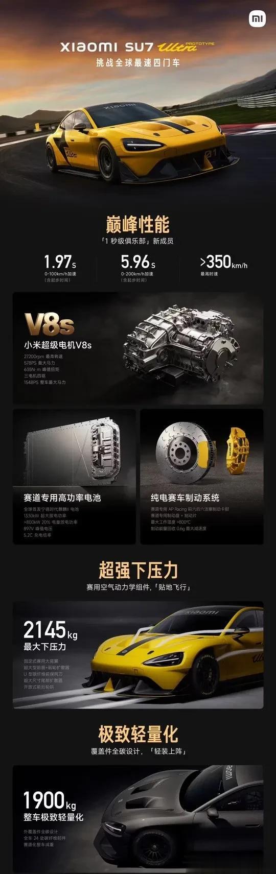 性能对标:竞速套装版(62.99万元)与保时捷Taycan Turbo GT(199.8万元)性能差距不足10%,价格仅为三分之一。国海证券评价,小米通过SU7 Ultra完成从“性价比”到“品价比”的跃迁,重塑了行业竞争格局。