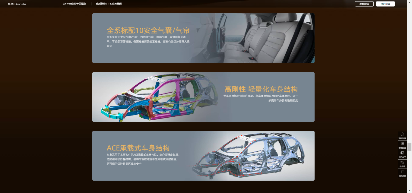 今年第六届《汽车风云盛典》活动聚焦“全维安全”主题。对此,一向将安全视为重中之重的东风本田,也为CR-V 全球30年荣耀款的用户提供了周全的守护,覆盖主被动安全各个环节。当意外发生时,全系标配的10个安全气囊能迅速展开,为前后排乘员构筑起一道从正面、侧面到膝部的防护网,有效减轻碰撞伤害。这份安全感,也深植于车辆的“骨骼”之中。整体采用高刚性轻量化车身结构,关键部位使用超高强度钢材,并创新应用HPA高强度胶提升整体强度。再加上本田独有的ACE承载式车身结构,能在碰撞瞬间充分吸收并分散能量,竭力保持乘员舱的完整,为家人留出至关重要的生存空间。