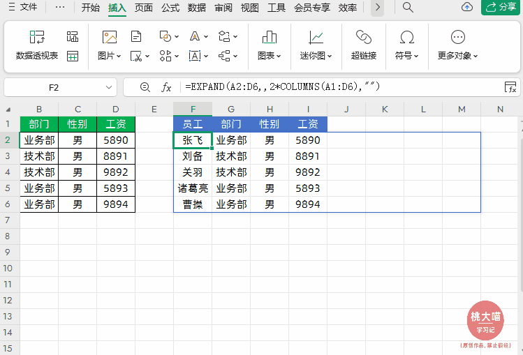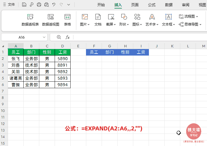 公式:=EXPAND(A2:D6,,2*COLUMNS(A1:D6),"")