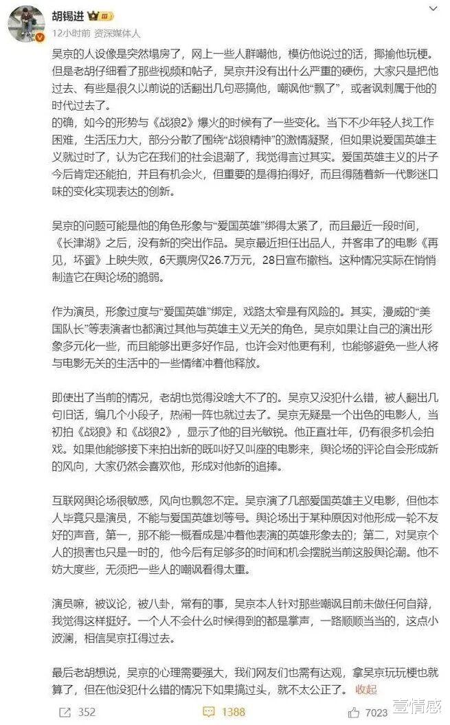 胡锡进的这篇文章,表面上看是在为吴京说话,但细读之下却能发现其中暗含的“春秋笔法”。
