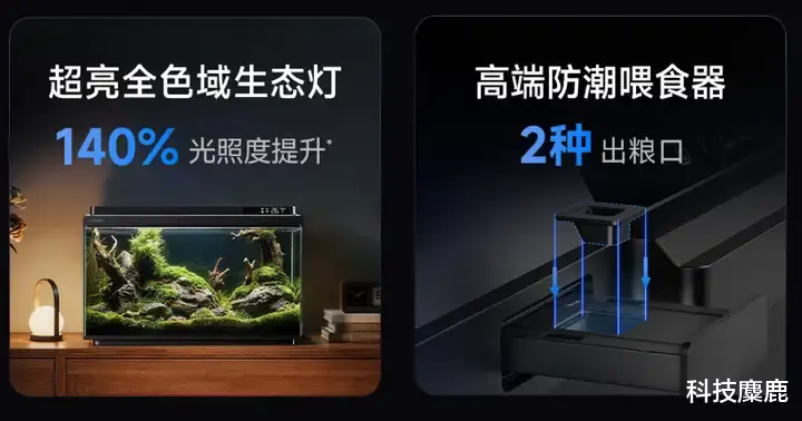 在硬件配置上,当贝智能鱼缸2S Ultra同样实现了全面进阶,超亮全色域生态灯将光照度提升140%,以全色域光谱模拟自然光照,既促进水草光合作用,也让缸内景观更鲜活生动;高端防潮喂食器配备两种出粮口,可适配不同颗粒大小的鱼粮,防潮设计避免粮质变潮,同时能精准控制喂食量,彻底消除用户的后顾之忧。