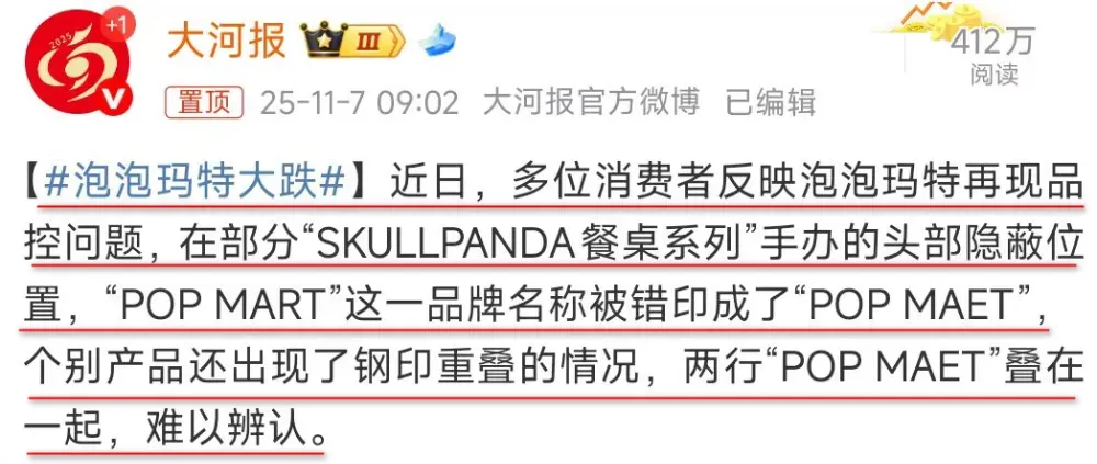 无独有偶,近期还有多位消费者反映泡泡玛特的部分“SKULLPANDA餐桌系列”连“POP MART”这一品牌名称都被错印成了“POP MAET”。