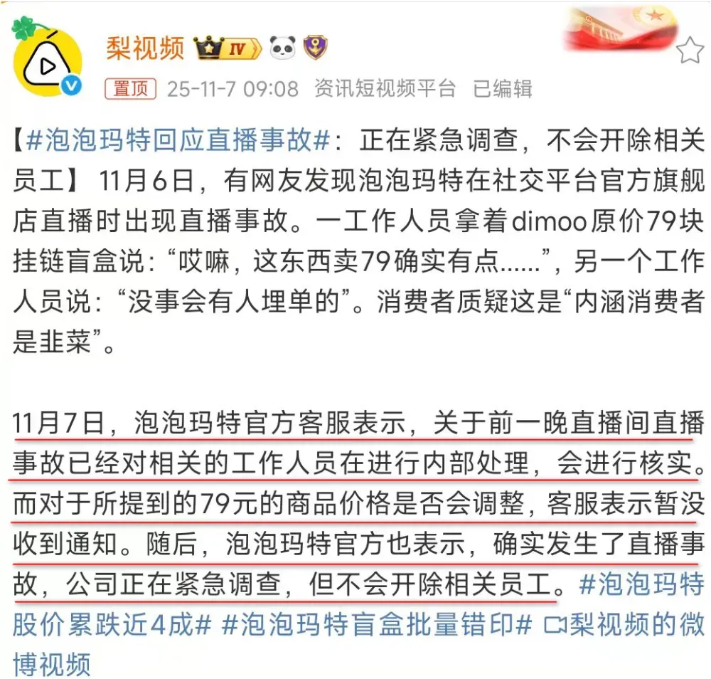 泡泡玛特今天的客服回应为,“关于前一晚直播间直播事故已经对相关的工作人员在进行内部处理,会进行核实。而对于所提到的79元的商品价格是否会调整,客服表示暂没收到通知。随后,泡泡玛特官方也表示,确实发生了直播事故,公司正在紧急调查,但不会开除相关员工。”