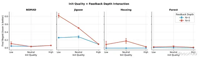 这说明更多信息并不改善推理,反而常常构成约束。差起点下效应最明显——负面反馈层层累积;强起点下差异可忽略。