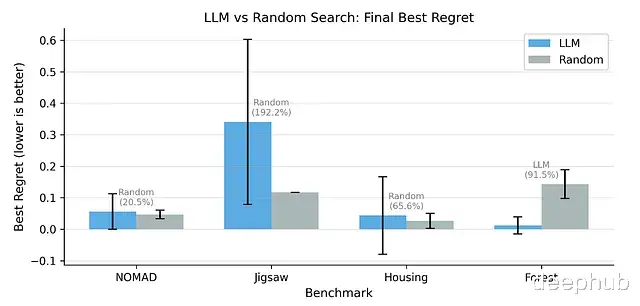 也就是说,复杂场景中无信息的随机探索可以优于 LLM 引导的优化。