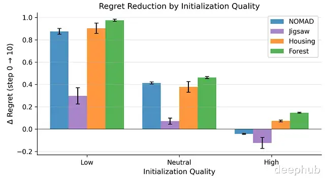 提供更长的历史信息(fd=5 vs. fd=1)在所有基准上持续恶化性能,归一化遗憾值上升,Jigsaw 上尤为突出。长串低分记录会"锚定" agent,压缩探索空间,阻碍恢复。
