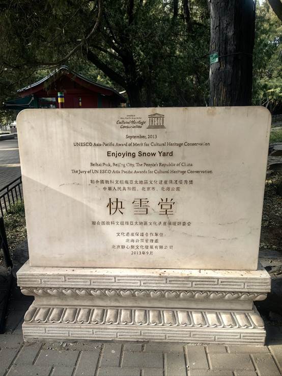(展示北京北海公园快雪堂外景照片及东西两廊石刻照片,图注:北海松坡,刻帖遗珍——《快雪堂帖》原石至今保存完好,是法帖史上的活化石。)