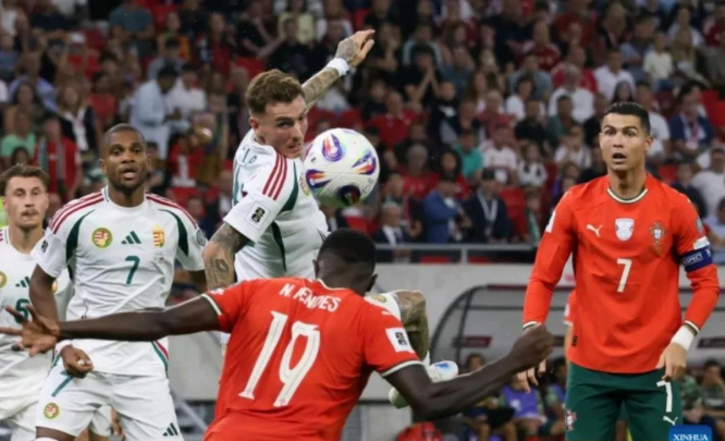 比赛末段,切尔内夫自摆乌龙帮助西班牙扩大优势,补时阶段奥亚萨瓦尔点射得手,将比分最终定格在4-0。此役过后,**西班牙队四战全胜积12分**,在E组强势领跑。## 03 C罗创纪录却留遗憾葡萄牙与匈牙利的比赛充满戏剧性。开场仅8分钟,匈牙利就由绍洛伊头球破门。关键时刻,**C罗挺身而出,先在第23分钟抢点推射破门**,这粒进球使他以40个进球独享世预赛历史射手王荣耀。上半场补时阶段,C罗再接努诺·门德斯传中推射得手,完成梅开二度,将世预赛进球数刷新至41球。
