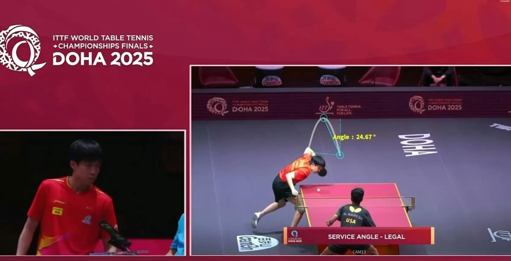 突发争议,冷静应对显自信比赛进行到第二局时,突发争议。裁判认为王楚钦发球抛球角度违规,这对于任何选手来说都可能是影响比赛节奏和心态的突发事件。然而,王楚钦表现出了极大的冷静和自信,他果断申请鹰眼挑战。这一举动源于他对自己发球技术的充分信任,正如他赛后所言:“通过队内的检验,自己的发球还是比较过关的。” 而事实也证明了他的自信并非盲目,鹰眼系统精确测量出其发球角度为 24.67°,远低于规定的 30° 上限,挑战成功。