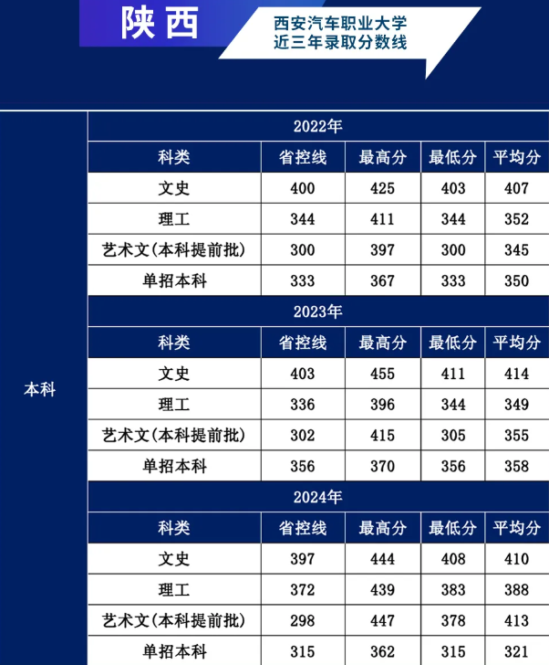 对刚过本科线的考生而言,西安汽车职业大学的录取分数极具亲和力:2022-2024年本科录取最低分常年紧贴省控线,理工类最低分仅超省控线0-11分,文史类最低分超省控线3-11分,刚过线考生报考录取机会极大,完全无需担心分数浪费。
