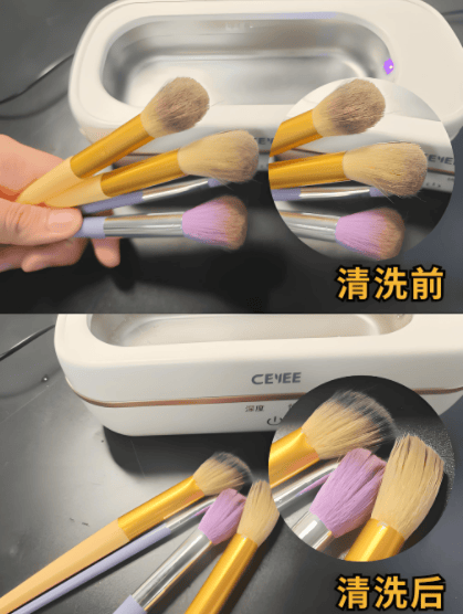 好处二:超声波清洗机还可以清洗美妆蛋、化妆刷等,这些粉尘堆积会产生细菌,在接触皮肤时引起皮肤过敏不适,还容易长痘。超声波清洗机能深层去除残留的粉尘污渍,避免细菌滋生,维护皮肤健康。