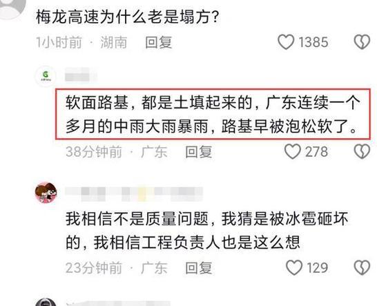 那么针对这起事件,网友们则有着不同的看法,一种认为是这种事故由天灾导致,毕竟在事故发生之前,广东一直在下雨,而一种则认为是人祸的原因,该高速的建造单位,可能偷工减料,导致这一事故的发生。