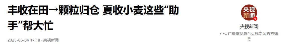 信息来源:央视新闻 丰收在田→颗粒归仓 夏收小麦这些“助手”帮大忙 2025-06-04