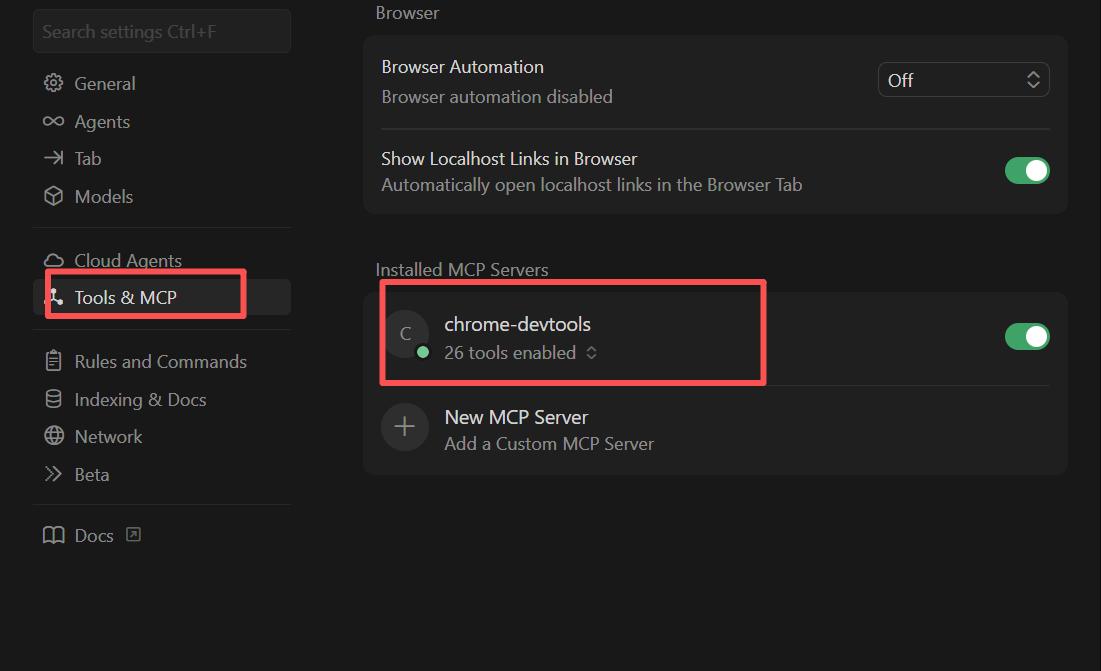 }保存后,重启编辑器。记得启动 Chrome 时加上调试端口参数(或者直接通过 AI 启动浏览器),连接建立后,奇迹就会发生。