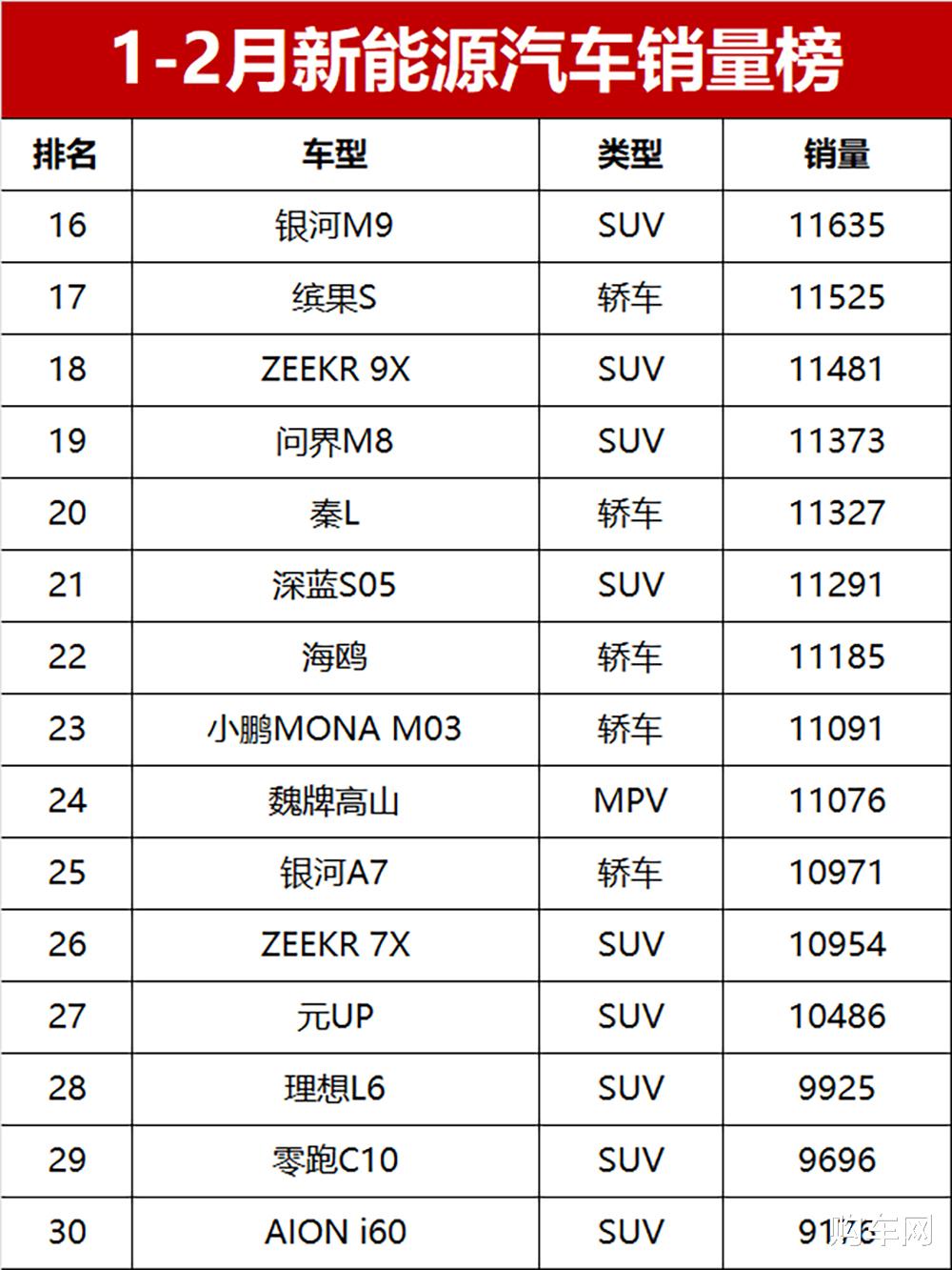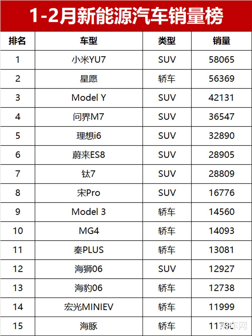 【2026年1-2月新能源乘用车零售销量排行榜】开年遇冷!乘联会最新数据显示,2026年1-2月国内新能源乘用车市场累计零售销量仅106.0万辆,同比暴跌25.7%,跌幅比整个乘用车市场高出6.8个百分点,市场渗透率也直接跌至41.1%,创下近一年来的新低。更直观的是,这两个月累计销量超过2万辆(相当于月均破万)的新能源车只有7款,而同期燃油车达到26款,差距悬殊。话不多说,完整版销量榜来了,看看你关注的车型有没有上榜!