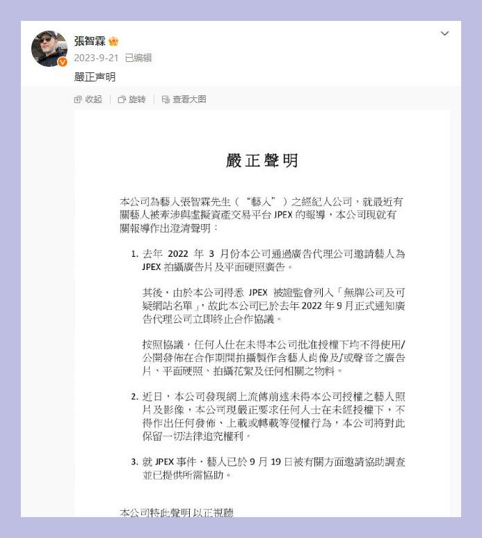 在被带走后的第三天,张智霖通过官方渠道发布了澄清声明,他坚称自己在参与拍摄之前,已经对JPEX进行了深入的背景调查。事实上,早在2022年9月,他就果断结束了与该公司的合作关系。他强调自己此次进公安局只是为了配合调查,绝非犯罪行为。