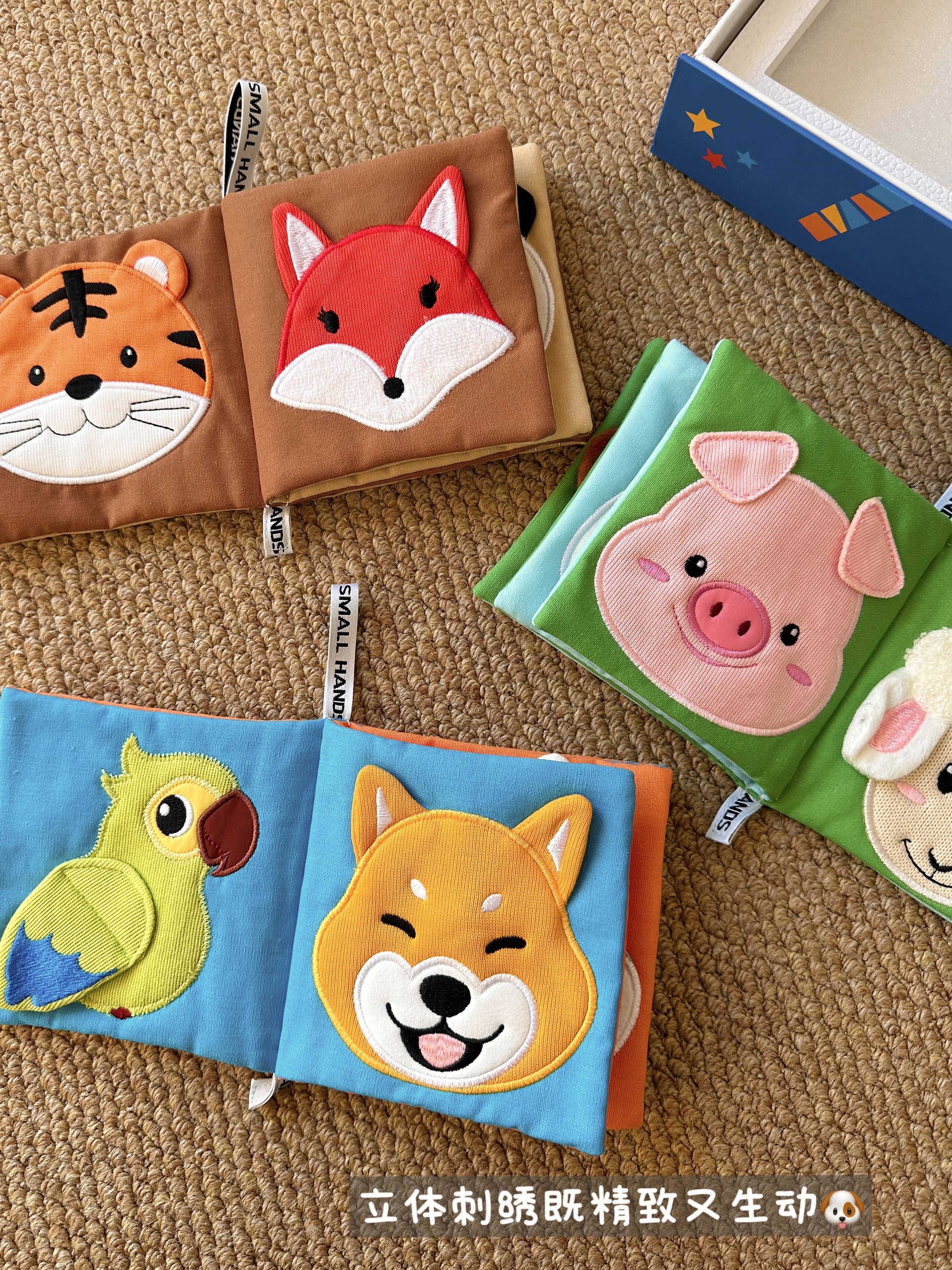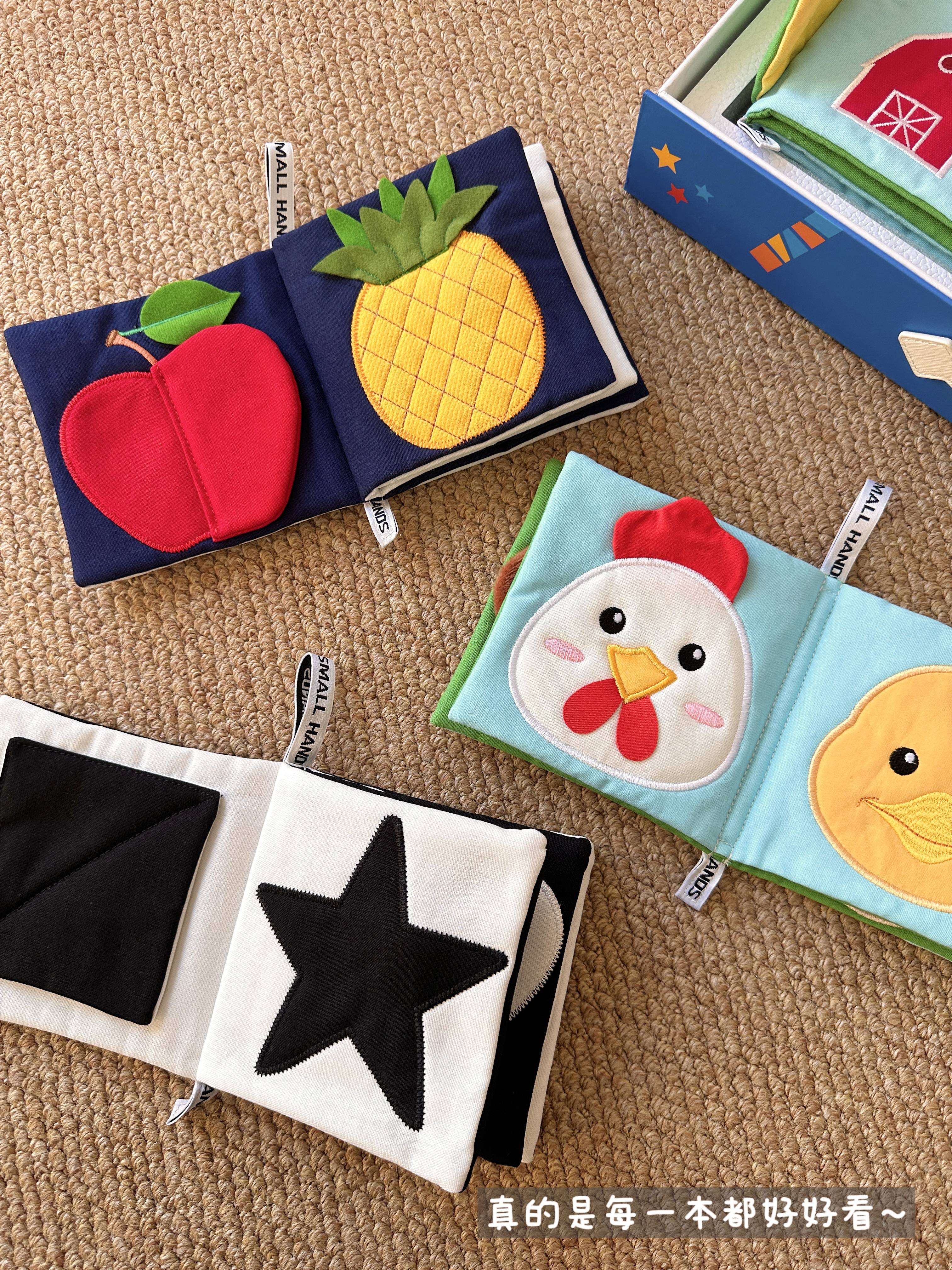 首先是基于婴儿宝宝安全柔软的本能选择。尤其是正处于口欲期的宝宝,普通绘本翻两页就沾满口水。但布书可以放心入嘴,亚麻、棉布上做的手工刺绣,材质符合国家安全标准且经过多道消毒程序,活灵活现的水果、蔬菜、萌宠们一一呈现~连牙床期的宝宝都能安全探索。有次宝宝把小手布书扔进餐椅,掉落的瞬间我下意识伸手去接,结果发现——这本轻飘飘的布书根本砸不疼。