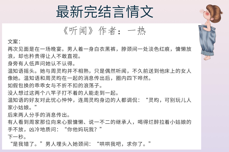 第六本:《听闻》作者:一热,全文47W字点评:男女主在校园中默默喜欢着对方,却都未曾说出口。课堂上,他不经意间看向她的目光,仿佛是在探寻一个宝藏;她收到他作业时,指尖那一抹微微的颤抖,都藏着难以言说的心思。他会在篮球场上为了她刻意表现,假装不经意地看向观众席,只为捕捉她的身影;她会在路过他座位时,悄悄放慢脚步,心里像揣了只小鹿乱撞。那些不经意间的眼神交汇,瞬间的脸红心跳,将那种青涩、纯真的暗恋情感,如细腻的画笔,描绘得丝丝入扣。让读者仿若置身其中,感受到青春时期爱情独有的美好与纯真,那是一段只属于年少时光的纯粹浪漫,在岁月的长河中闪耀着独特的光芒。