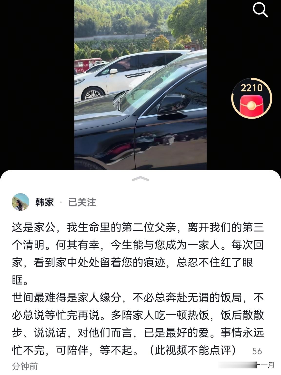 养家那边的韩家姐姐,在上午发出了一个祭祖的视频,并留文字纪念自己的公公。