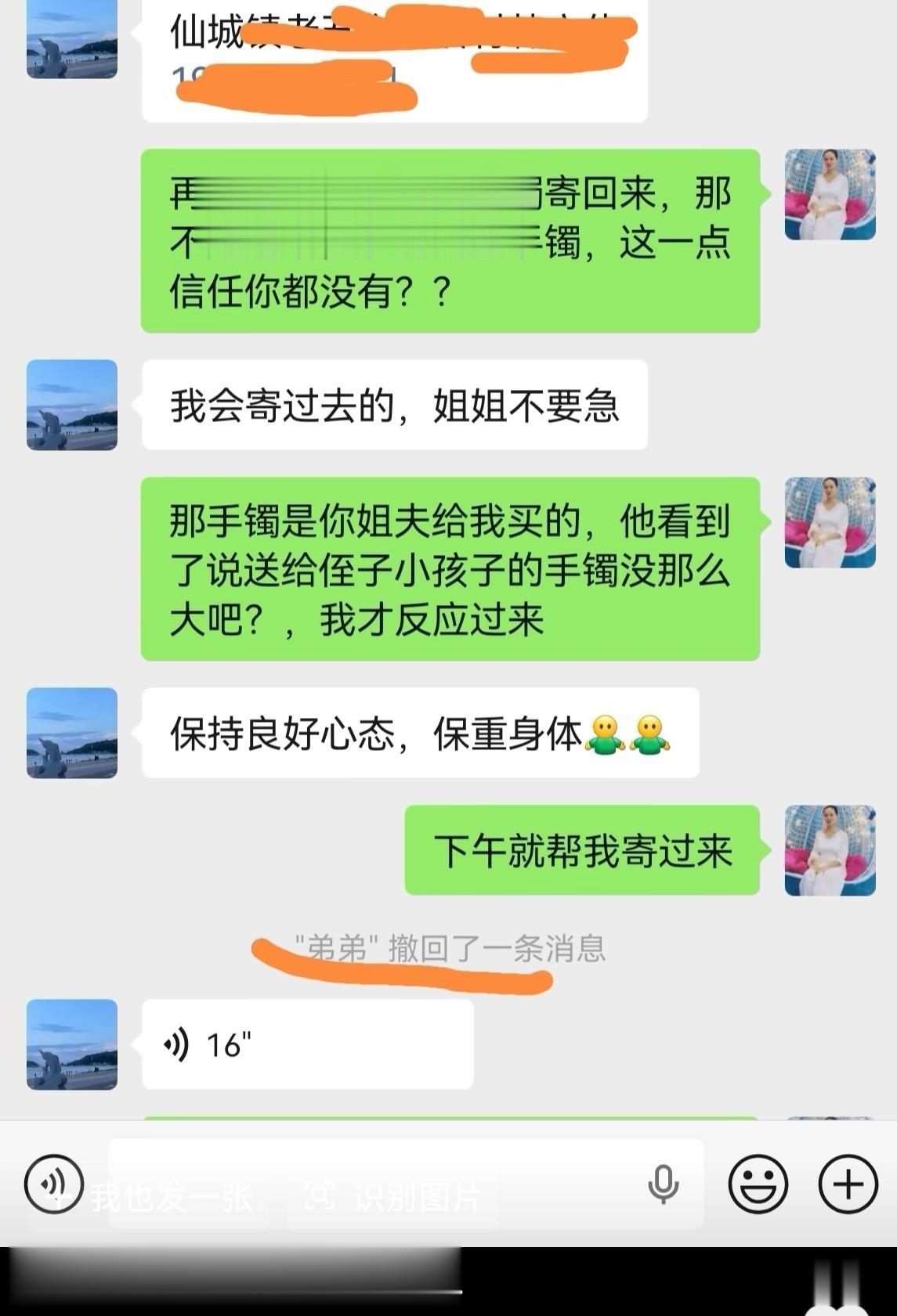 看上面这个微信截图,弟弟把手镯寄了回去,姐姐说话的语气就变柔和了。